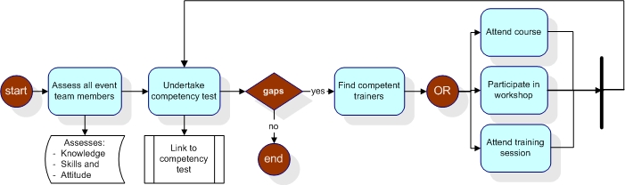 Curriculum Development: training, workshops and tertiary courses Competency in event management is essential these days. The new International Competency Standard Event Management is highly recommended. The best way to recognize if you or your event teams need training is to follow the process below. If there are gaps then it is highly advisable to send the members to training from experts with experience in the day to day management of events. It is well to remember: event operations contain the major risks and, just like engineers or doctors, having a university degree is not enough!
